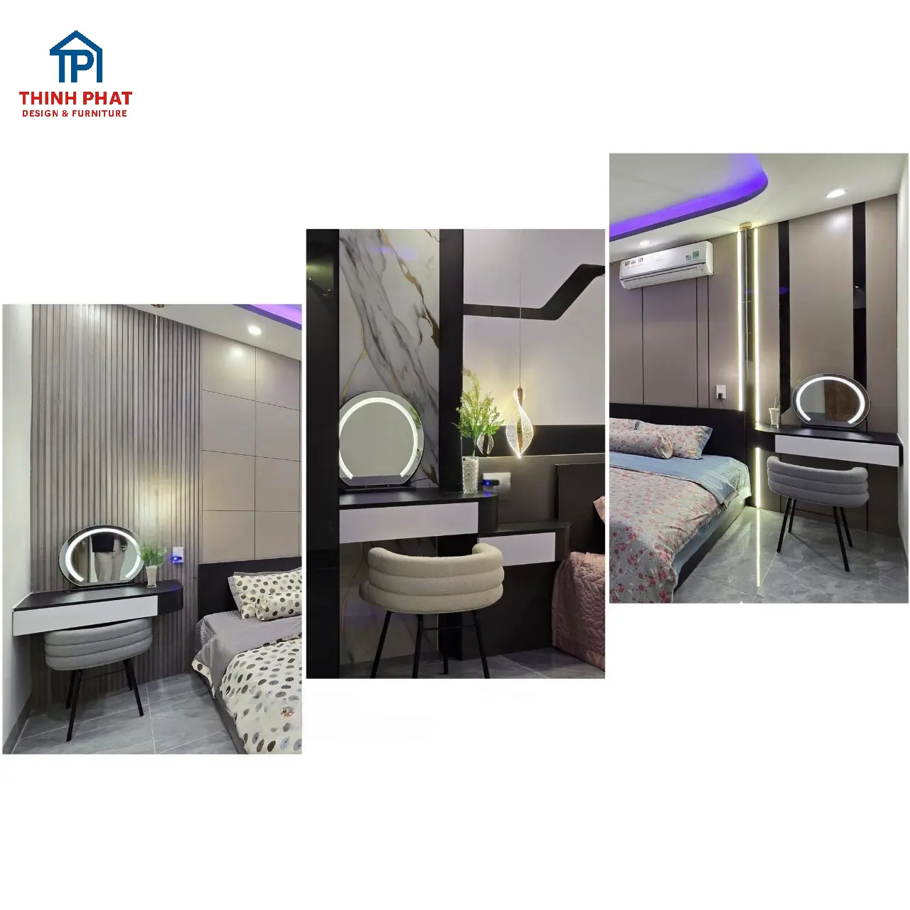 Bộ bàn trang điểm + ghế ngồi: Thiết kế gọn gàng, tích hợp gương LED, giúp phòng ngủ thêm tiện nghi và thẩm mỹ.